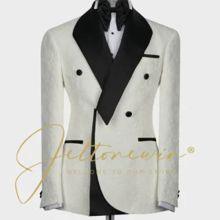 Jacquard Double Breasted Tuxedo with Black Satin Shawl Lapel 2 Piece Slim Fit Men’s Formal Wear for Wedding and Gala Events