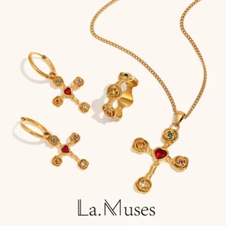 La. Muses Colored Cubic Zirconia Flower Shaped Stainless Steel Women's Jewelry Set PVD Coated Waterproof Jewelry Gift