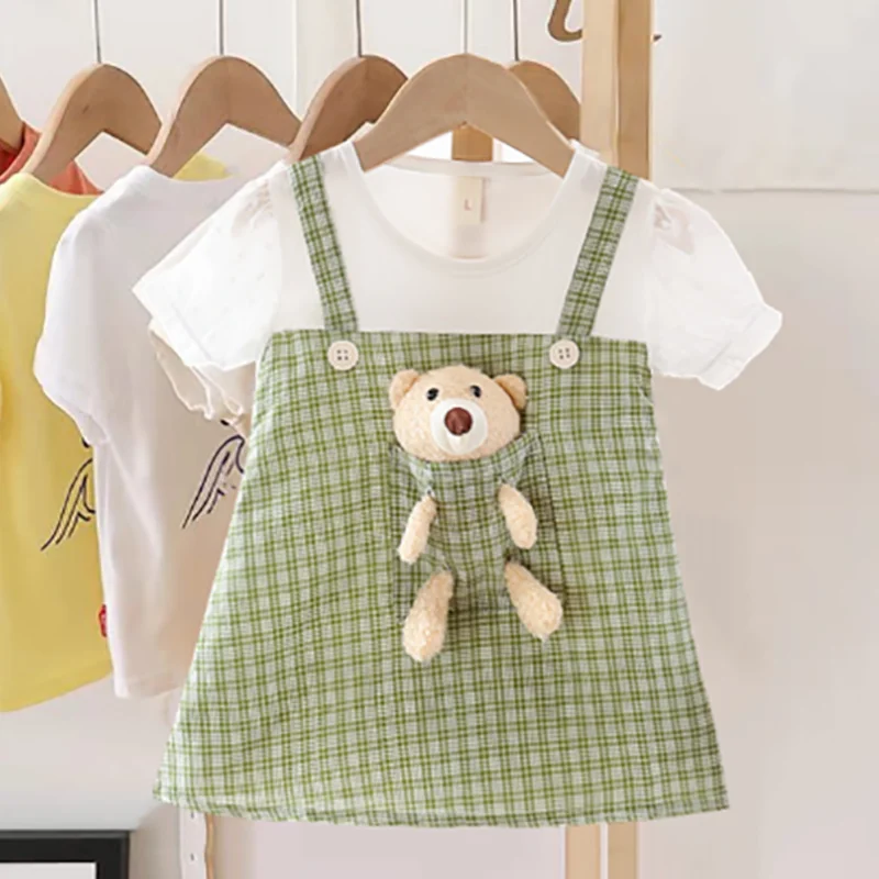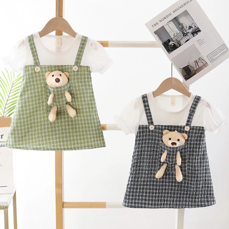 0-4Y Baby Girl Dress With Bear Pocket Elegant Princess Dress Plaid Toddler Outfit Short Sleeve Children Clothing vestidos A1160