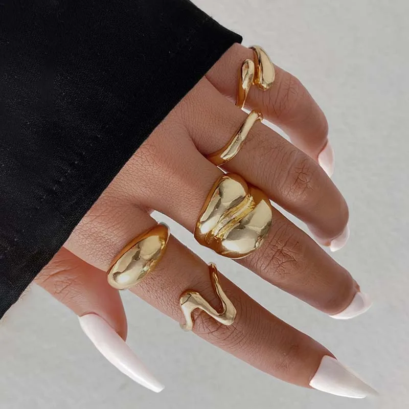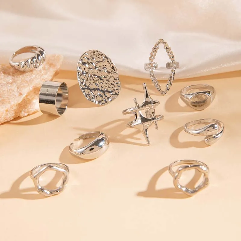 10Pcs/Set Fashion Metal Lava Lines Star Rings Set For Women Exaggerated Gold Color Geometric Smooth Chunky Ring Jewelry