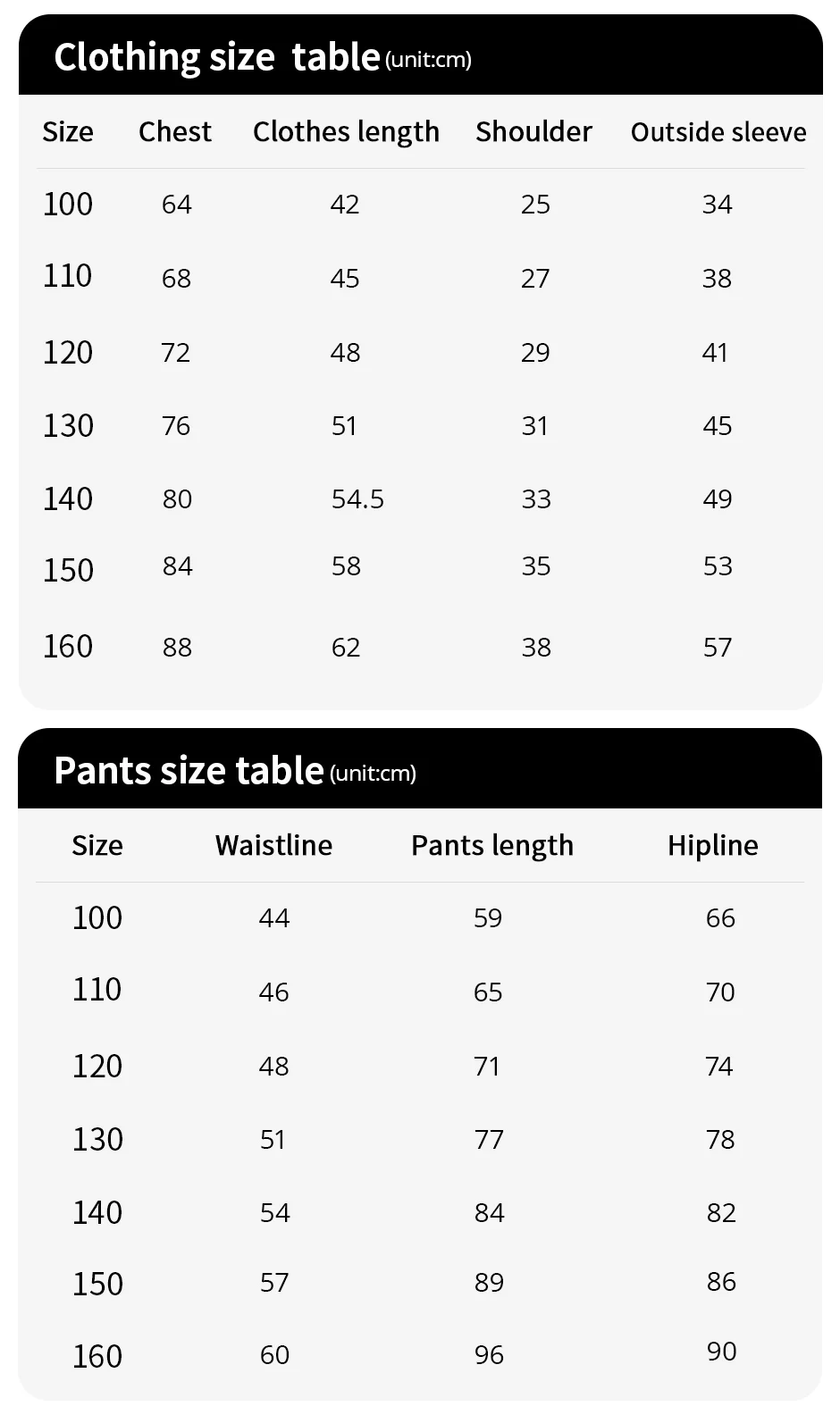 | Kid Size | 110, 120, 160, 100, 150, 130, 140 |