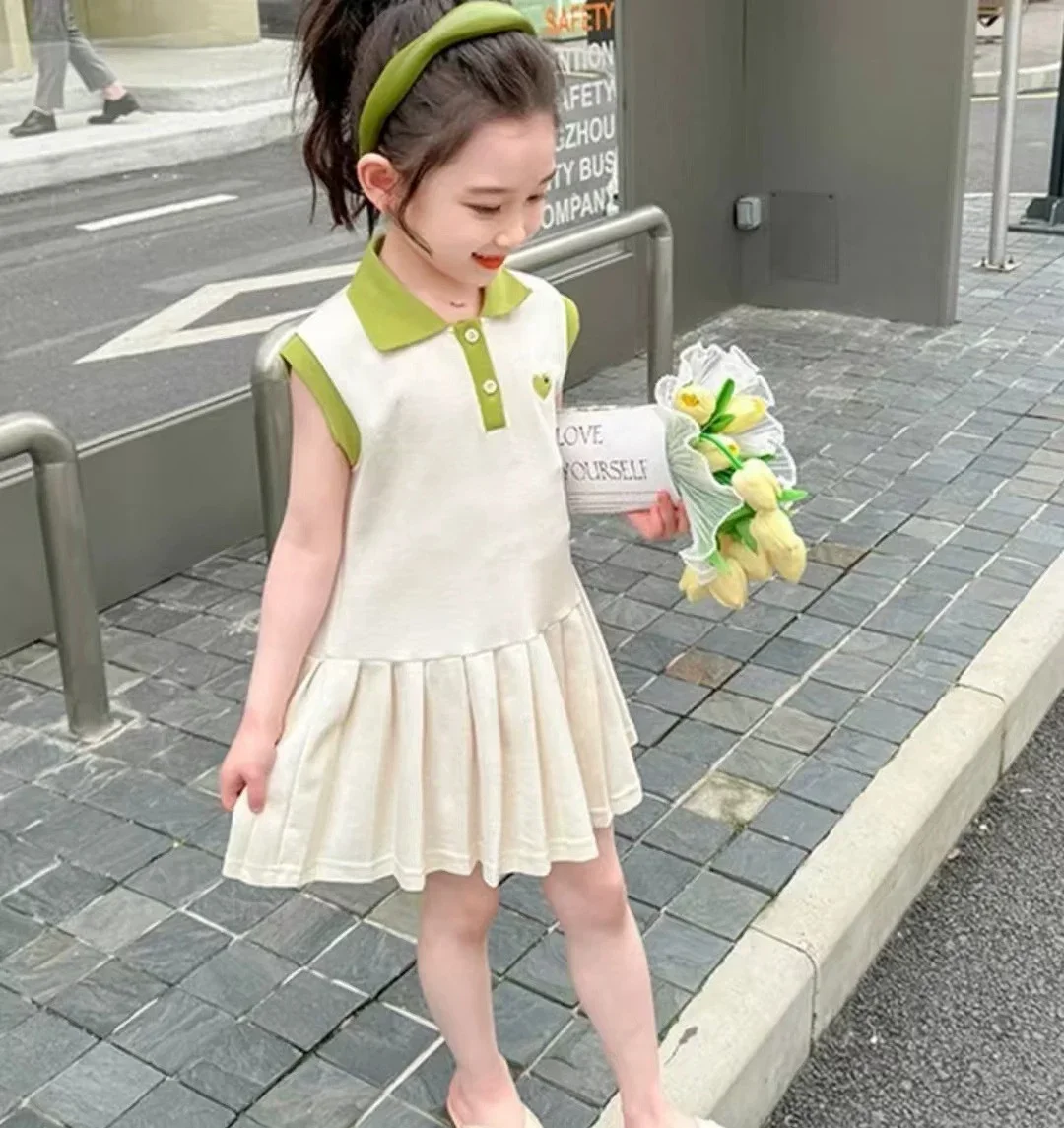 Bera Leader Korean Version Sleeveless Pleated Dress Solid Color Round Neck Children’s Clothes Summer Kids Dresses for Girls Wear
