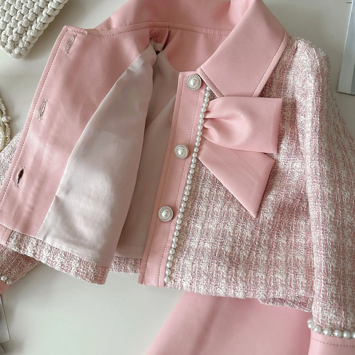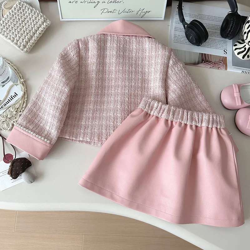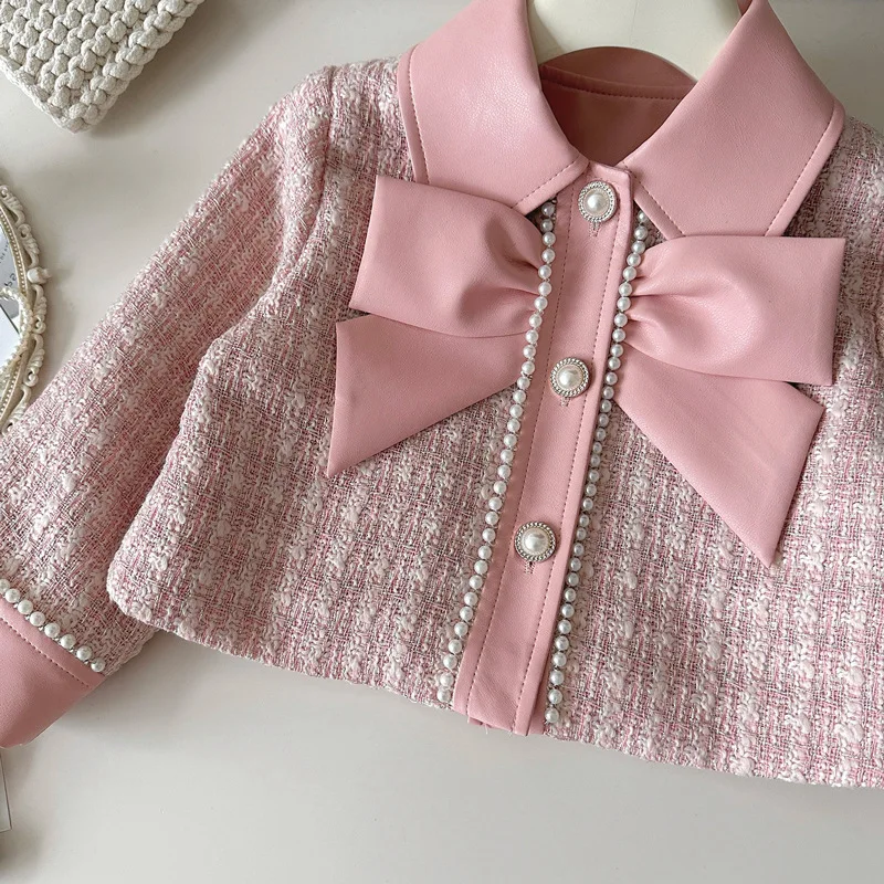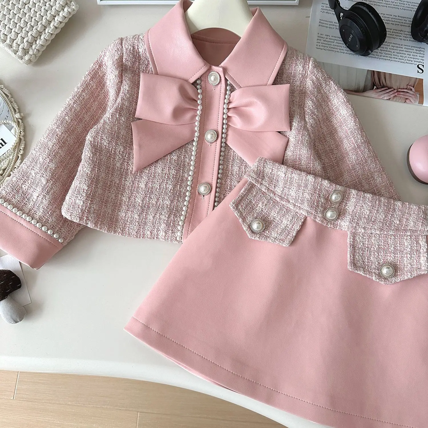 2026 Spring Kids Girls 2PCS Clothes Turn Down Collar Bow Pink Baby Girls Coat Suits Loose A-line Skirts Outfit Children Girl Set