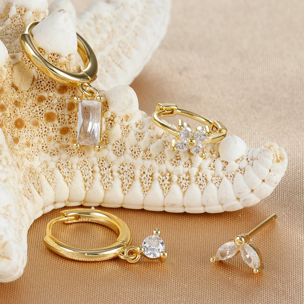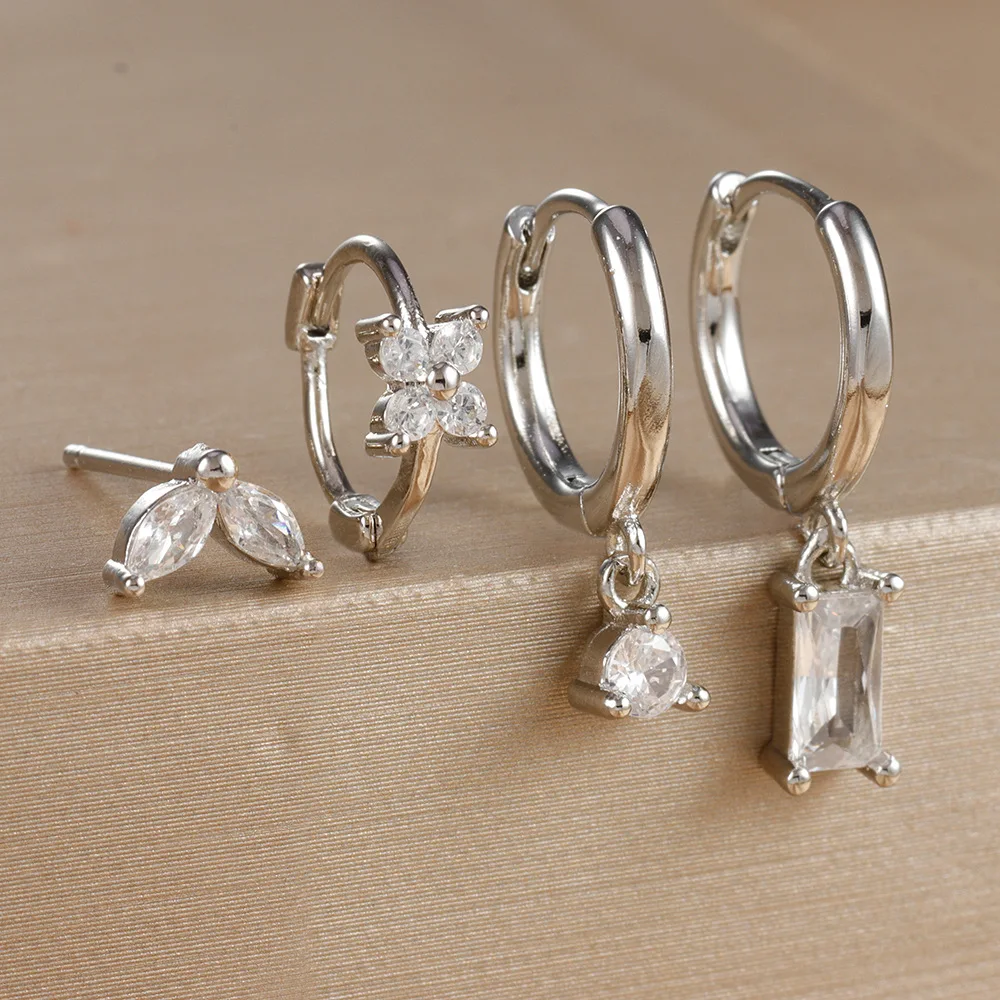 4PCS Flower Square Earrings Set for Women Girl Luxury Zircon Stainless Steel Cartilage Piercing Hoop Earring Statement Jewelry