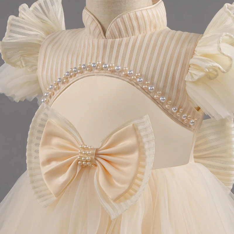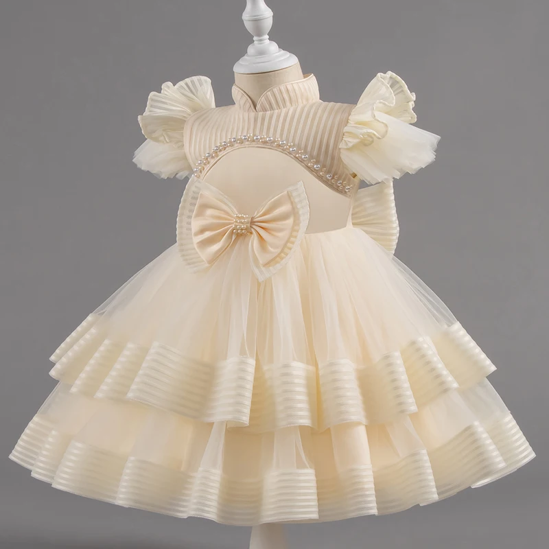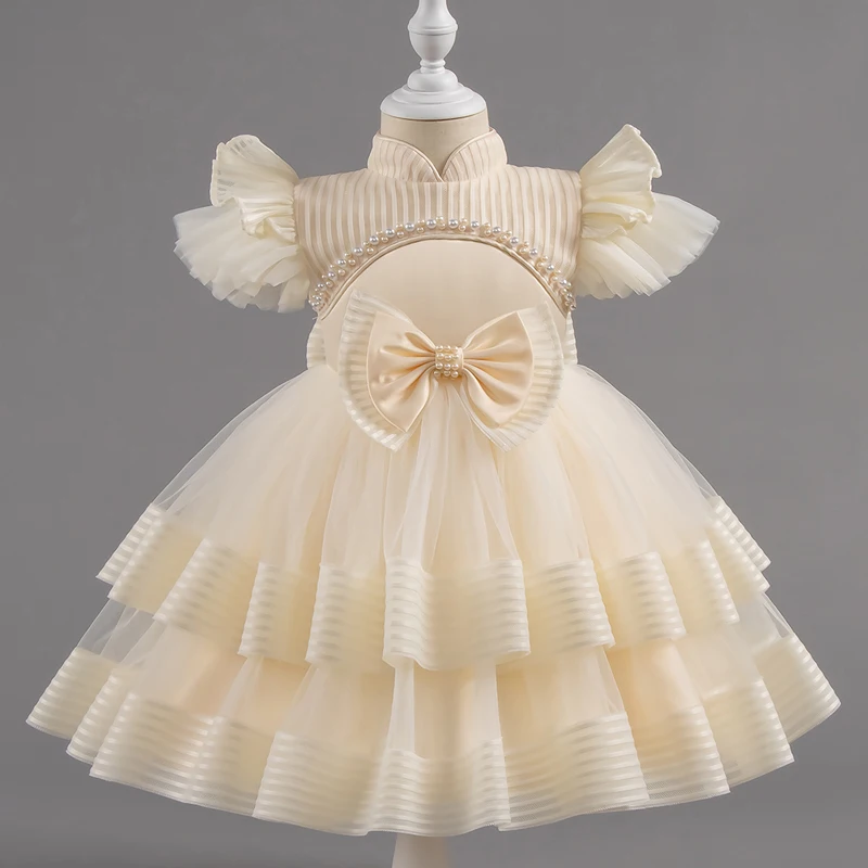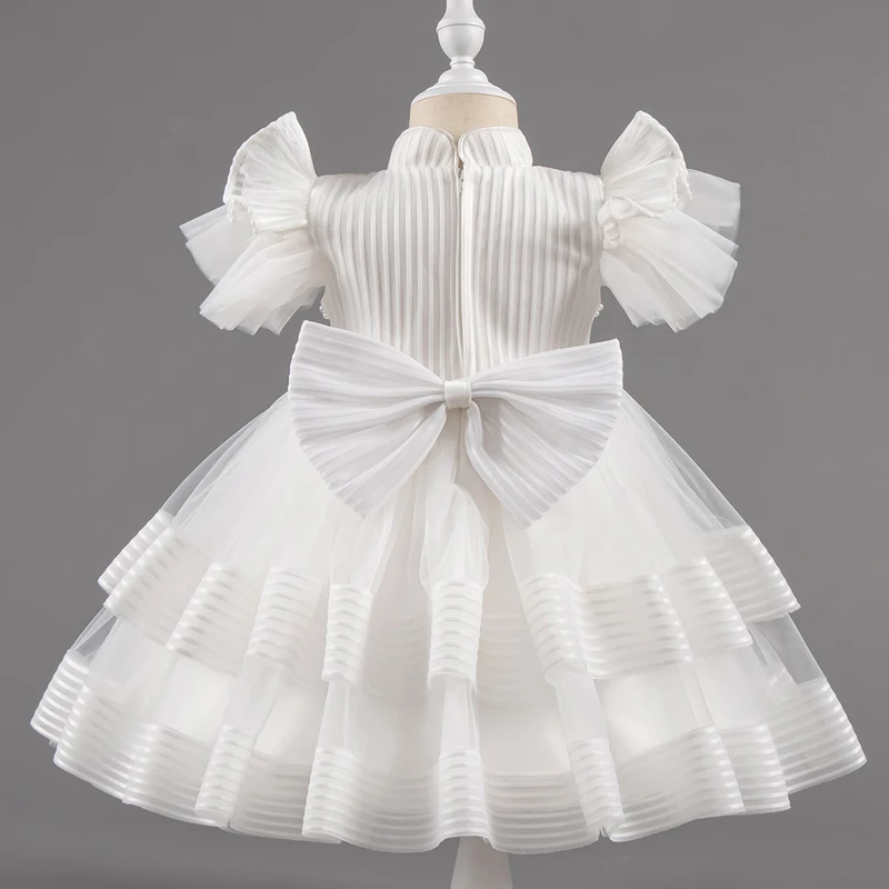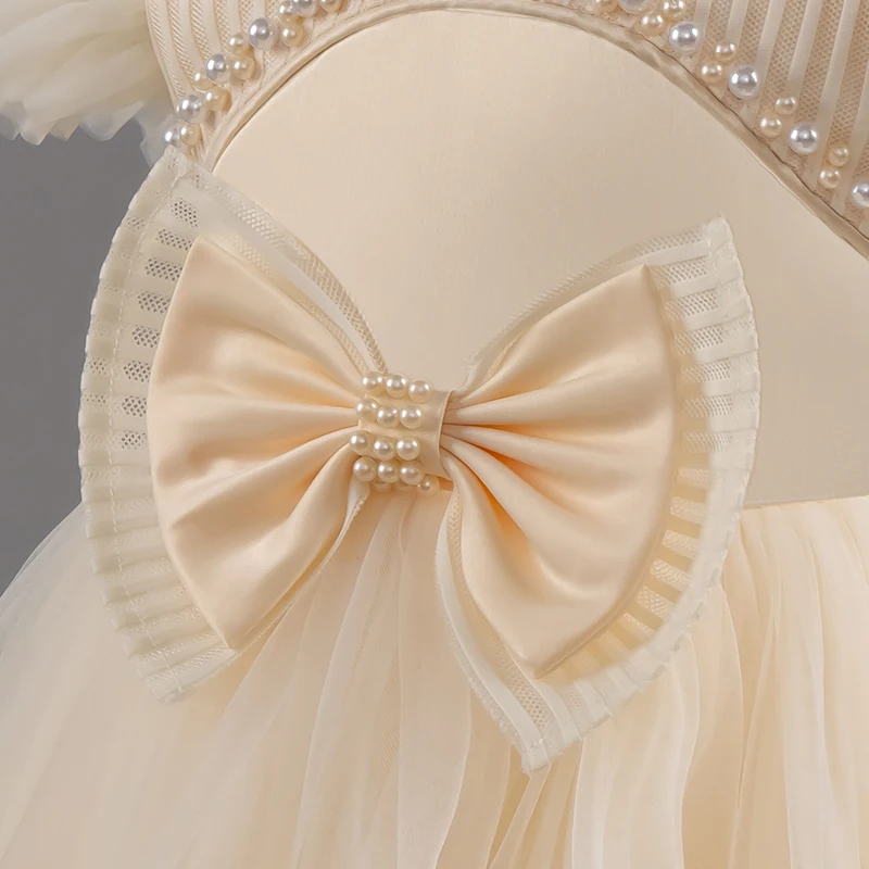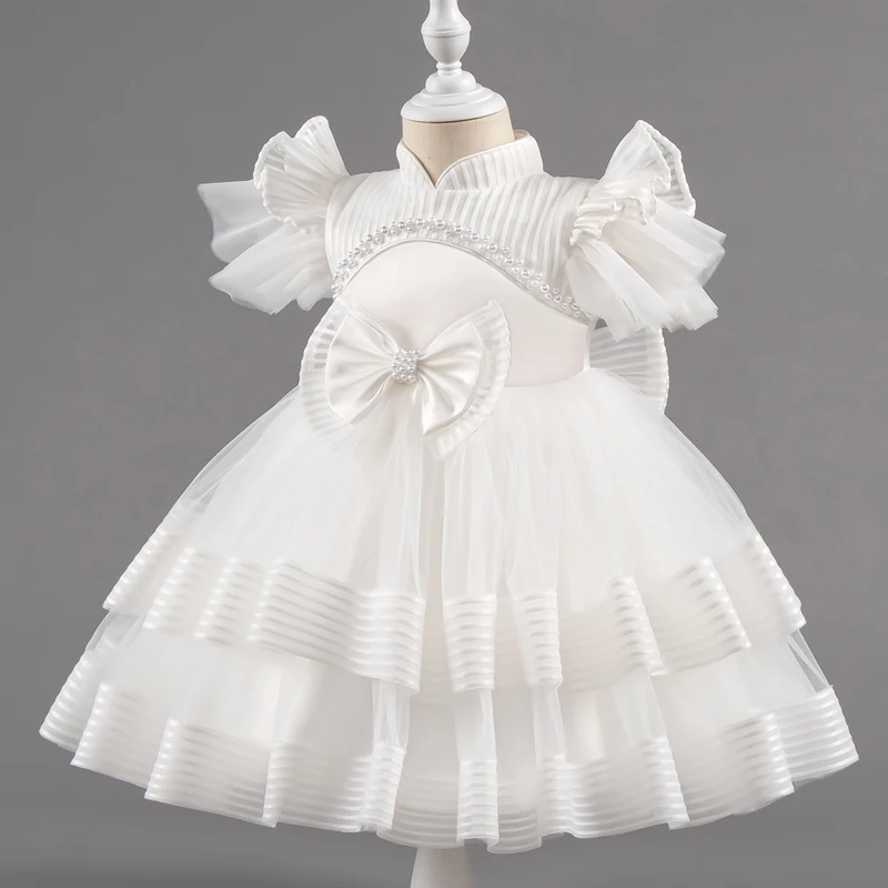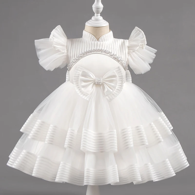 Baby Girl Princess Bow Pearl Silk Dress White Clothing Infant Toddler Vintage Vestido Wedding Party Birthday Baby Clothes 1-14Y