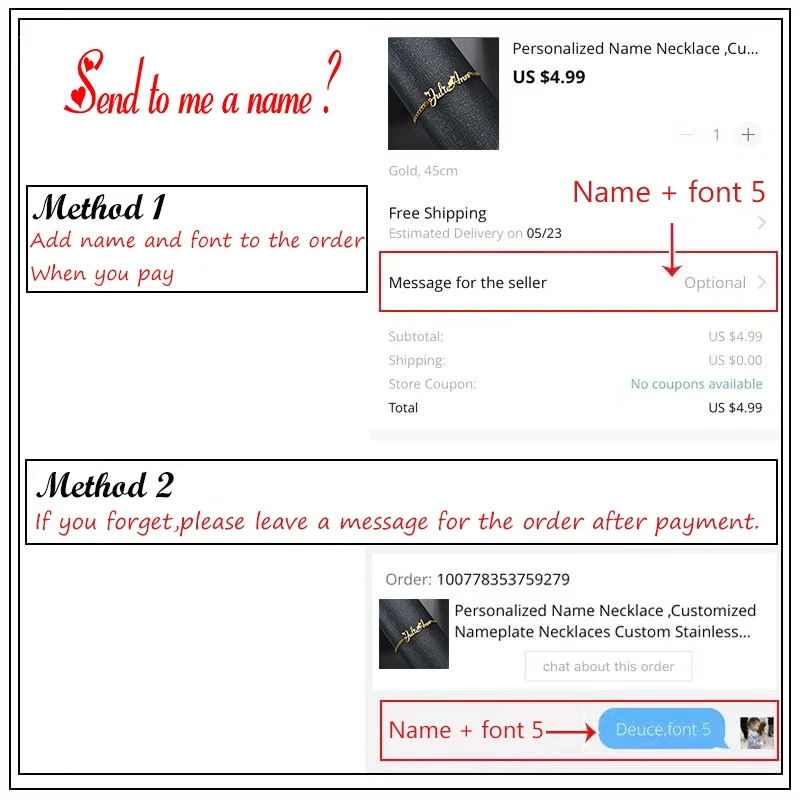 1. After place an order, tell us : name + font