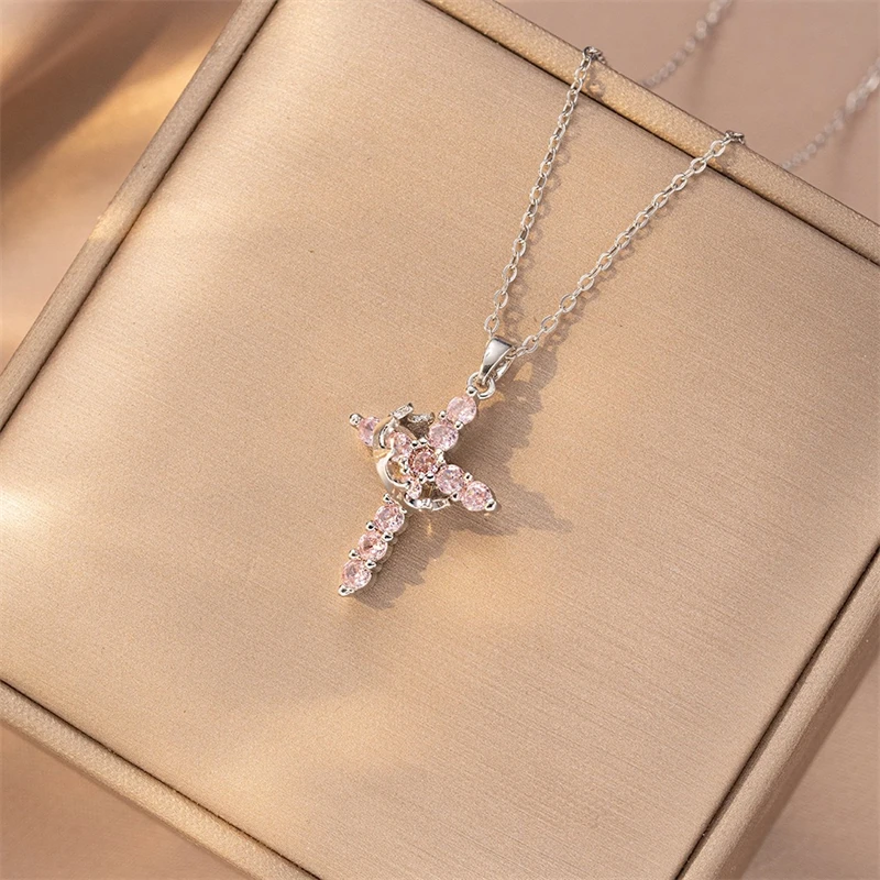 Exquisite Crown Cross Rhinestone Rotating Necklace for Women Fashion Copper Stainless Steel Necklace Party Banquet Jewelry Gift