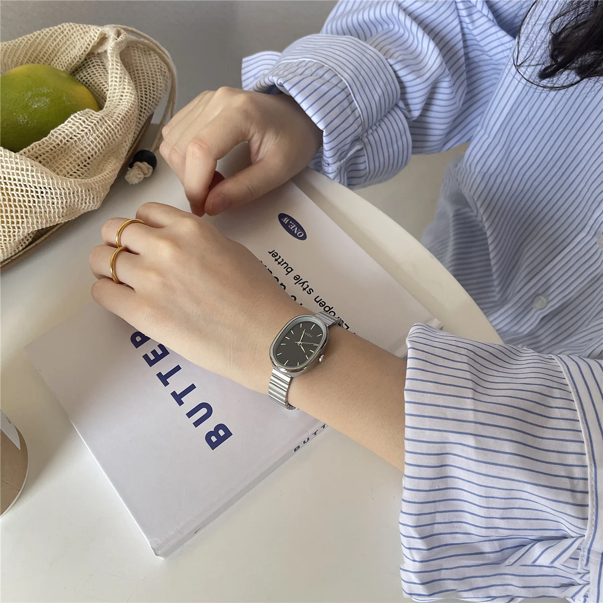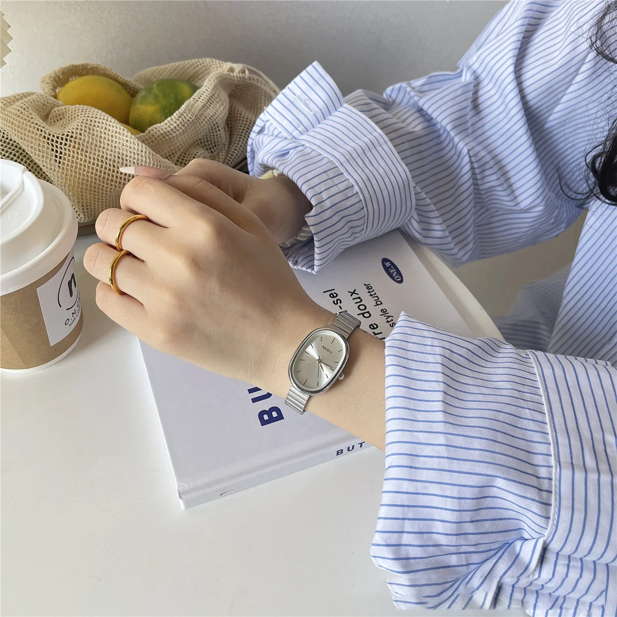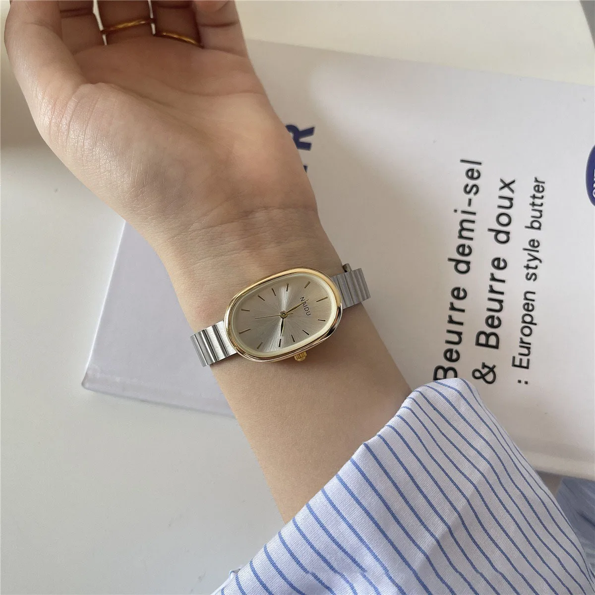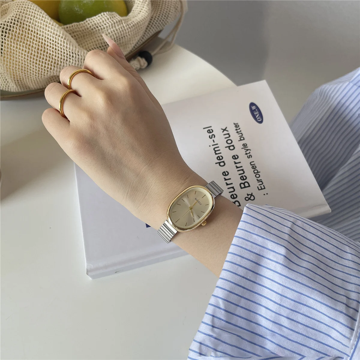 Metal Linked Watch with Oval Dial Compact Korean Women’s Watch Bamboo Strap Watch Pointer Style Women’s Watch Quartz Watch Gift