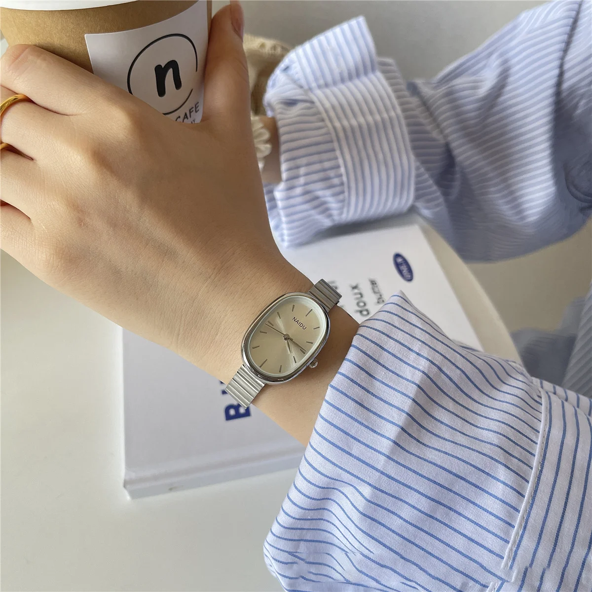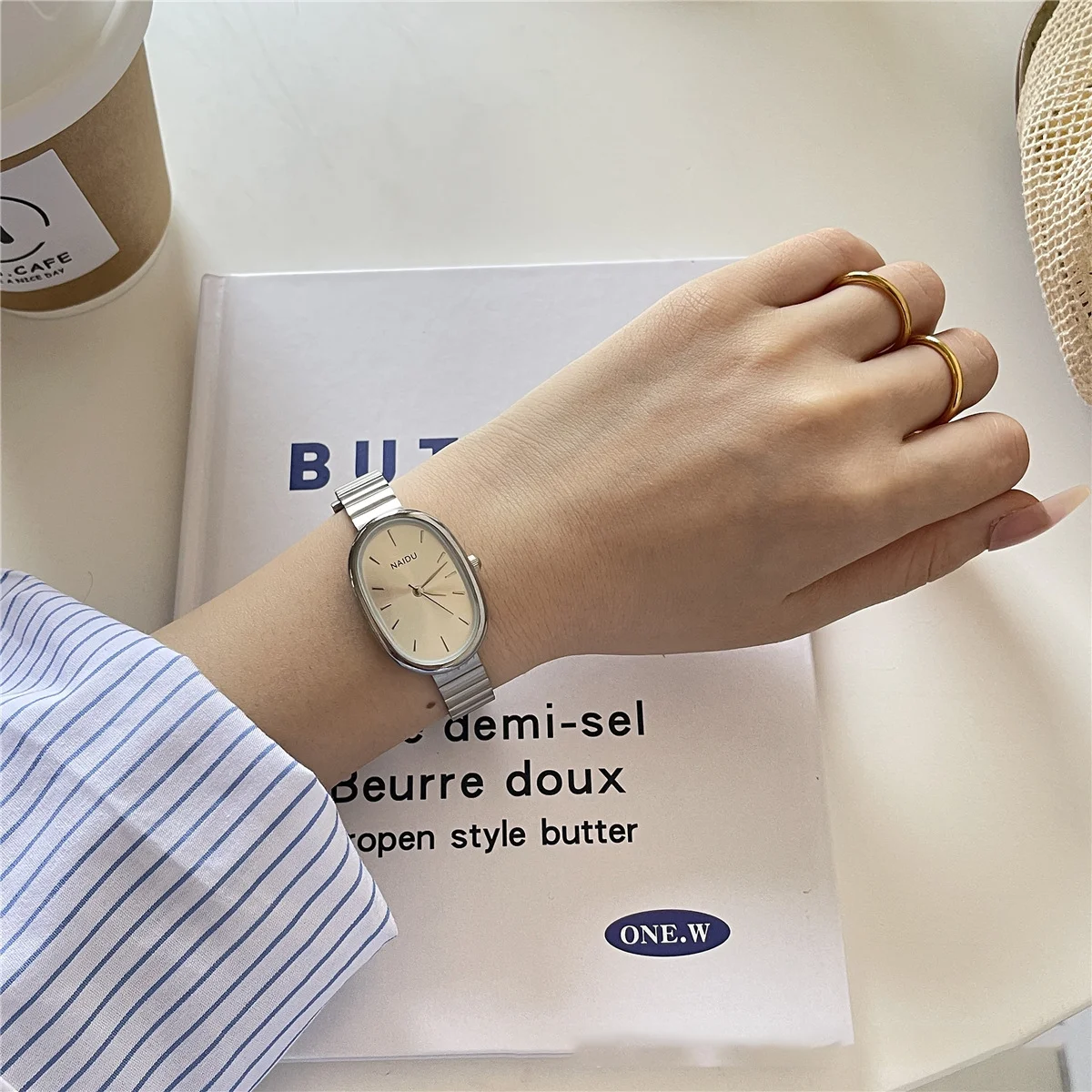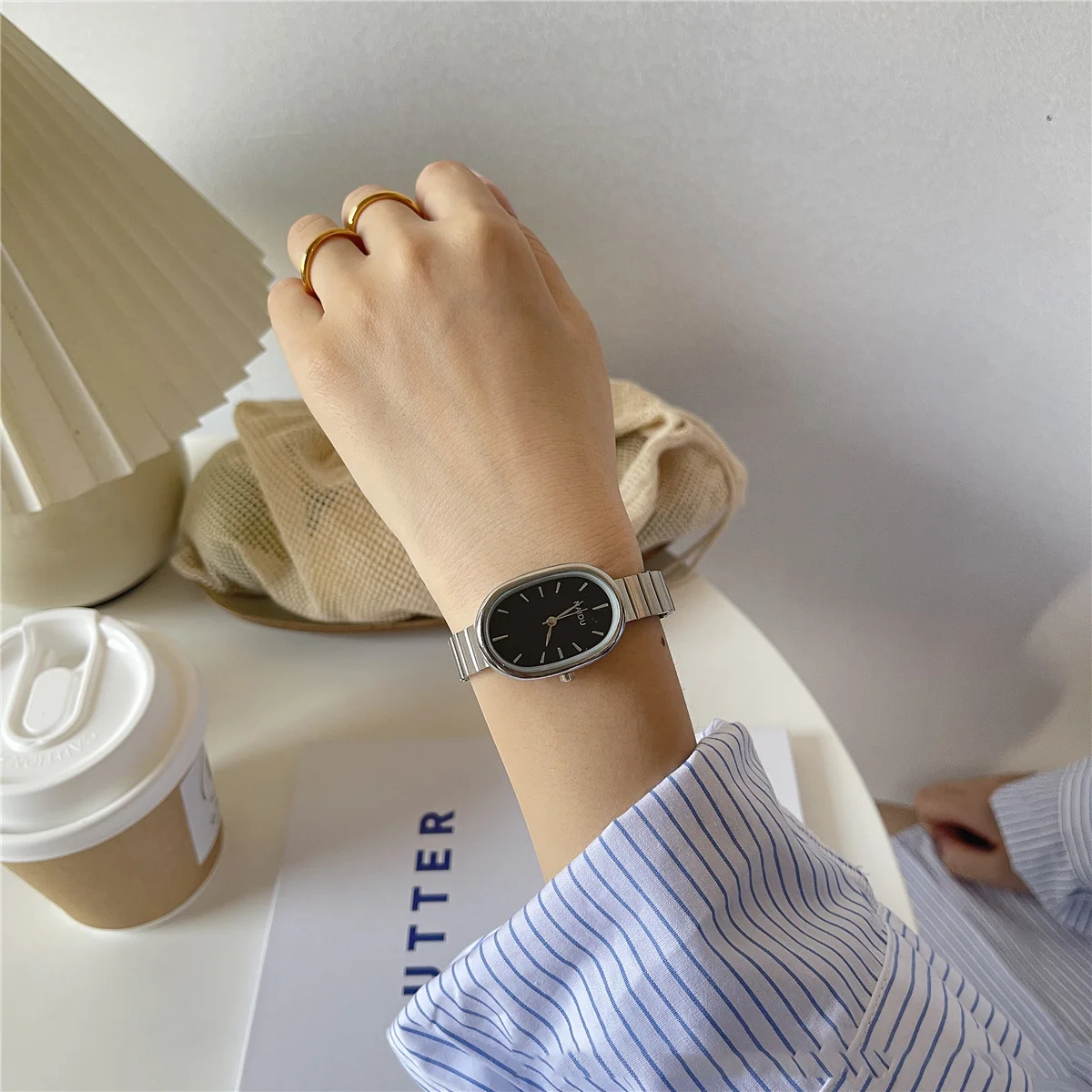 Metal Linked Watch with Oval Dial Compact Korean Women’s Watch Bamboo Strap Watch Pointer Style Women’s Watch Quartz Watch Gift