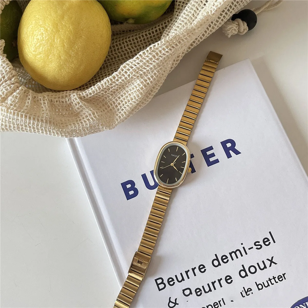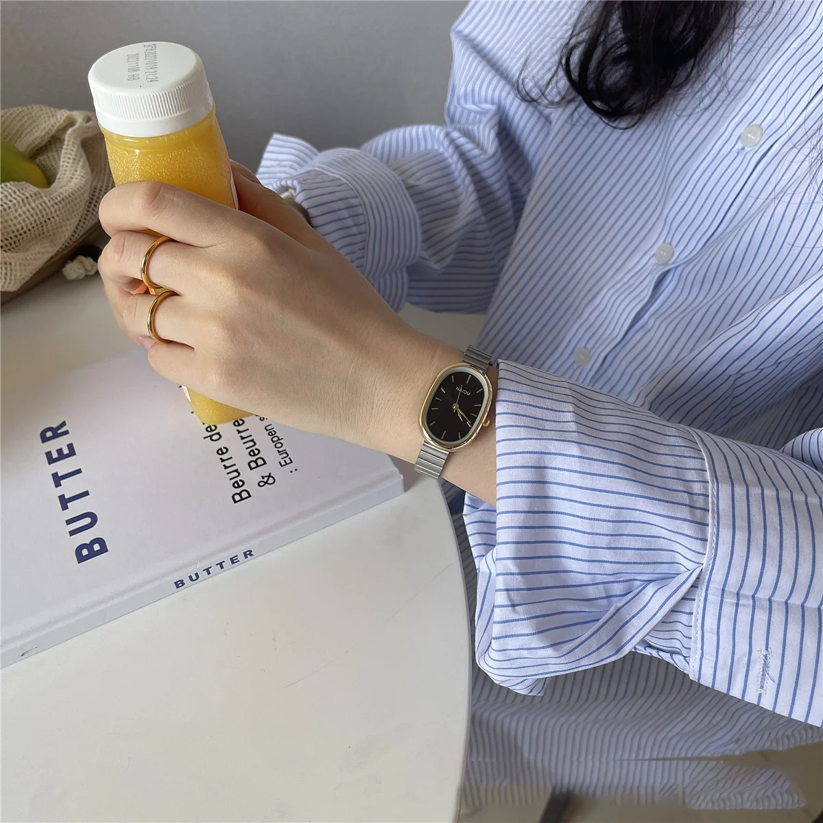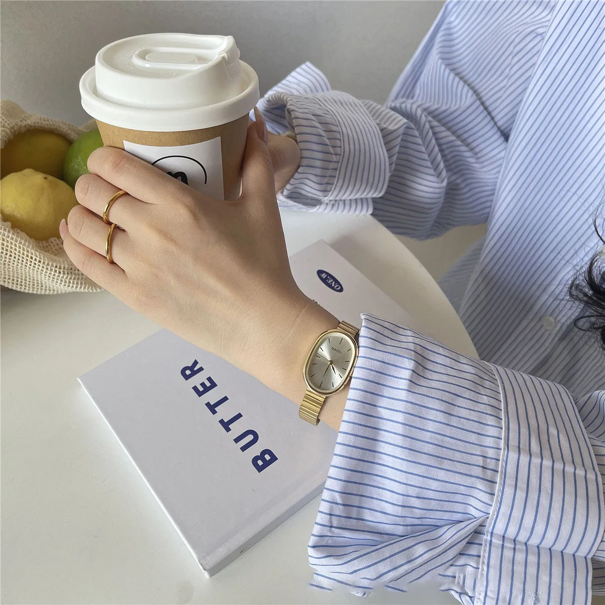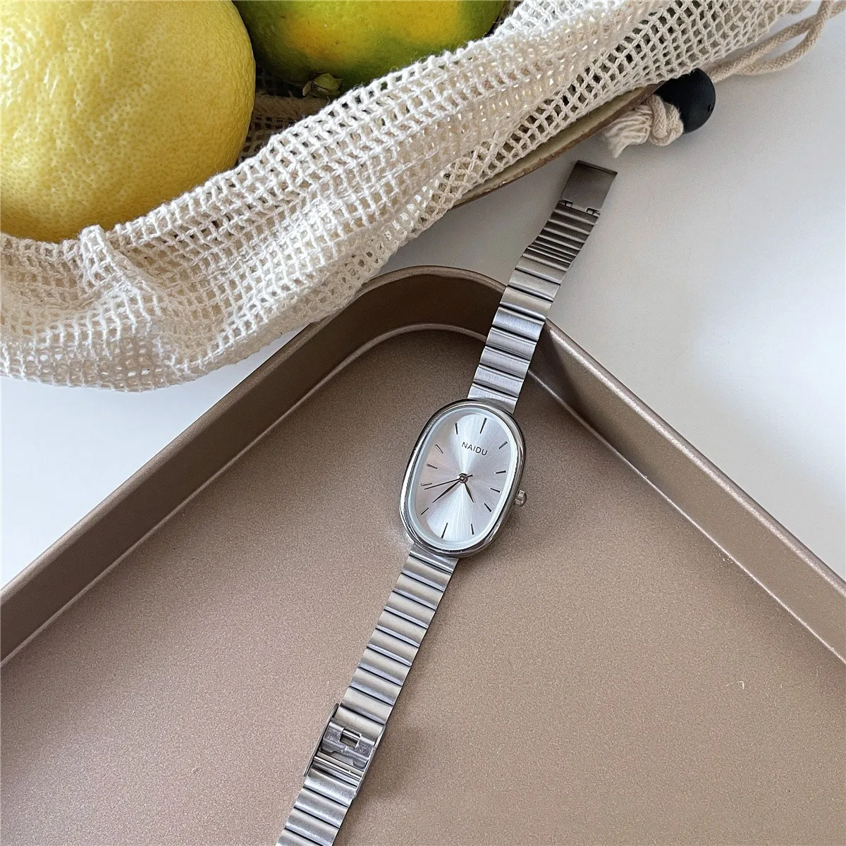 Metal Linked Watch with Oval Dial Compact Korean Women’s Watch Bamboo Strap Watch Pointer Style Women’s Watch Quartz Watch Gift