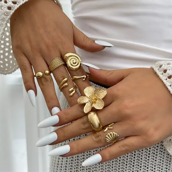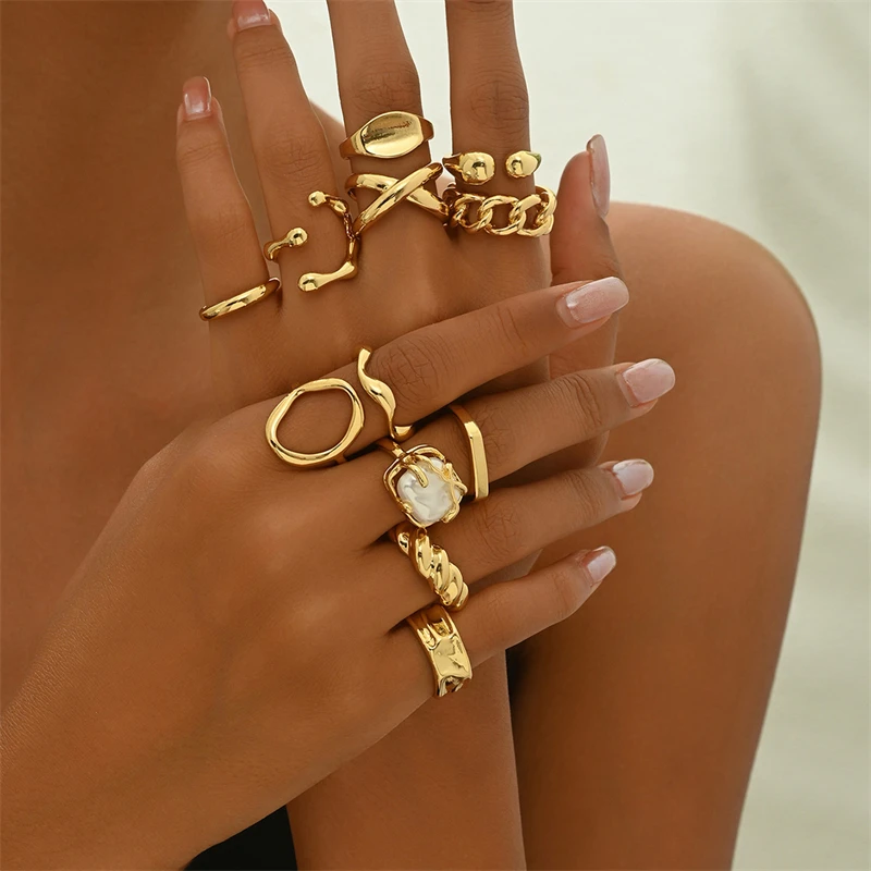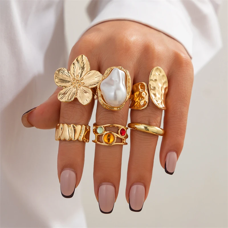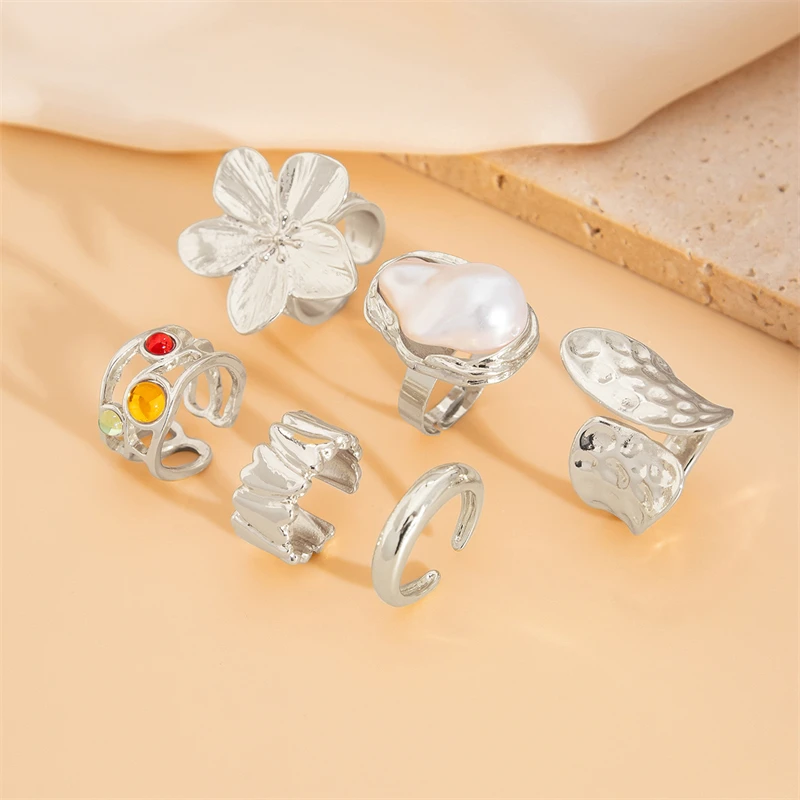 Punk Vintage Irregular Liquid Metal Finger Rings Set For Women Men Heart Flower Geometric Pearl Open Rings Luxury Trendy Jewelry